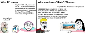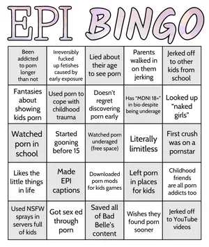Early porn introduction, more commonly known by its initials EPI is the articulation of provocative and suggestive media created by troons and pedophiles specifically made to circulate in spaces where recipients observing the said media are minors, as an attempt to give them early exposure to pornographic material in the hopes of them devolving into porn addicts or "one of them" later down the line[2], which is a tactic that a certain notorious pedophile used. This can come in the form of sexually stimulating furry art, popular phrasals, or hypersexual memetic mediums that glorify the emasculation of one's own virility, often presented as "jokes" in a rabbit hole known as irony poisoning, something most failtrolls have fallen victim to. Many gooners reminiscence about their first exposure to pornography as a child. EPI can found in various LGBTQ+ friendly spaces such as Gooncord, particular subreddits such as r/196 and r/teenfemboys etc.