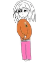 She appears to have white hair, dark eyes, notably the left eye is shadowed by her hair, orange sweater, pink jeans or trousers and barefoot. A 'teen pointed out that she also has a Scholar flower on top right of her sweater.