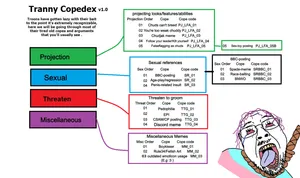 Trannies are well-known within soy culture because soyjaks are used to mock effeminate soyboys. Soyteens don't like them for what they represent; porn-addled manbabies who convert kids into degenerates just like them. This is also why acting like or supporting transgender people is the most common form of baiting on the Sharty. There are several soyjak variants based on them. Furthermore, a popular phrase called "Transheart" is used to express a liking towards something typically in a sarcastic manner within soy culture.[Because they just do, OKAY?!?]
